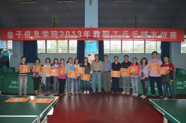 2013年教职工乒乓球友谊赛在川大体育中心乒乓球馆完美上演。比赛共吸引了来自全院的40余名教职工选手。学院蒋斌书记、陈笃海副书记、工会熊淑华主席亲临比赛现场并参与了比赛,最终余艳梅、杨晓敏老师,王君、吴小强老师,余艳梅和王君老师分别问鼎女双、男双、女单、男单各项。